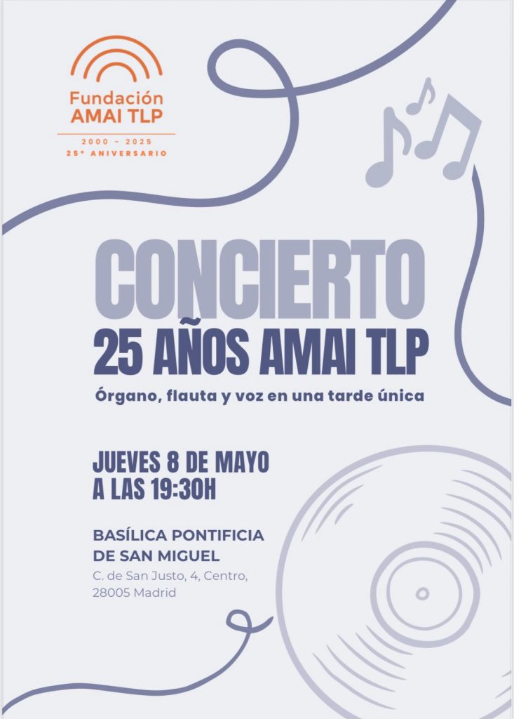 El jueves 8 de mayo, la fundación AMAI TLP celebra un concierto para conmemorar su 25 aniversario. Para el concierto ha contado con nuestra colaboración. Hemos diseñado un recital con soprano, flauta y órgano que esperamos que sea del agrado de los miembros de las fundación y sus familiares y amigos.